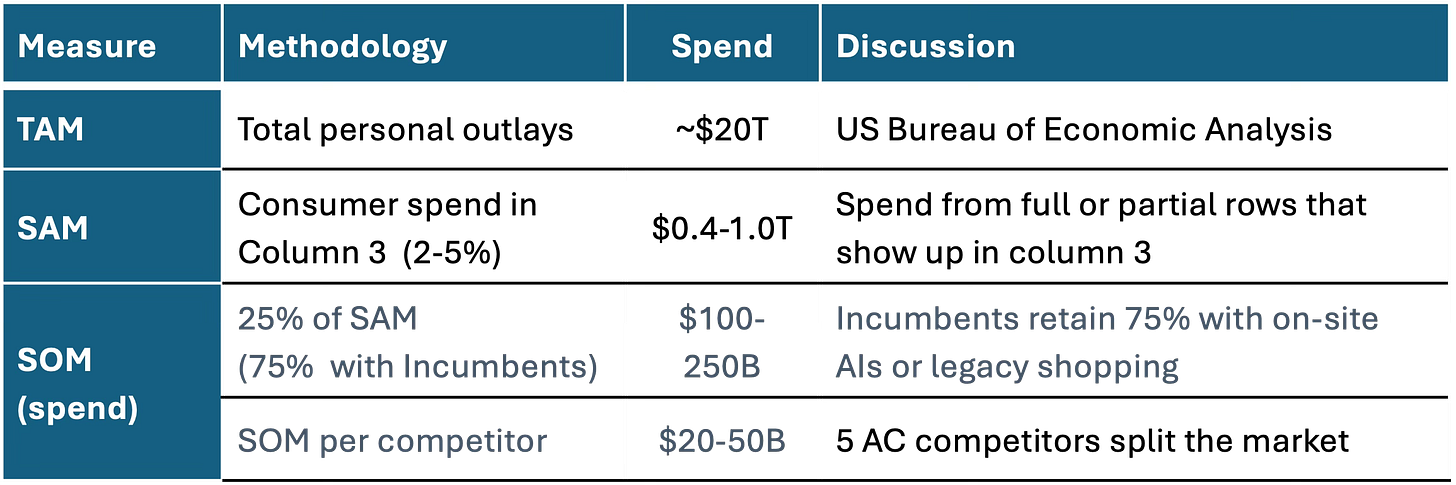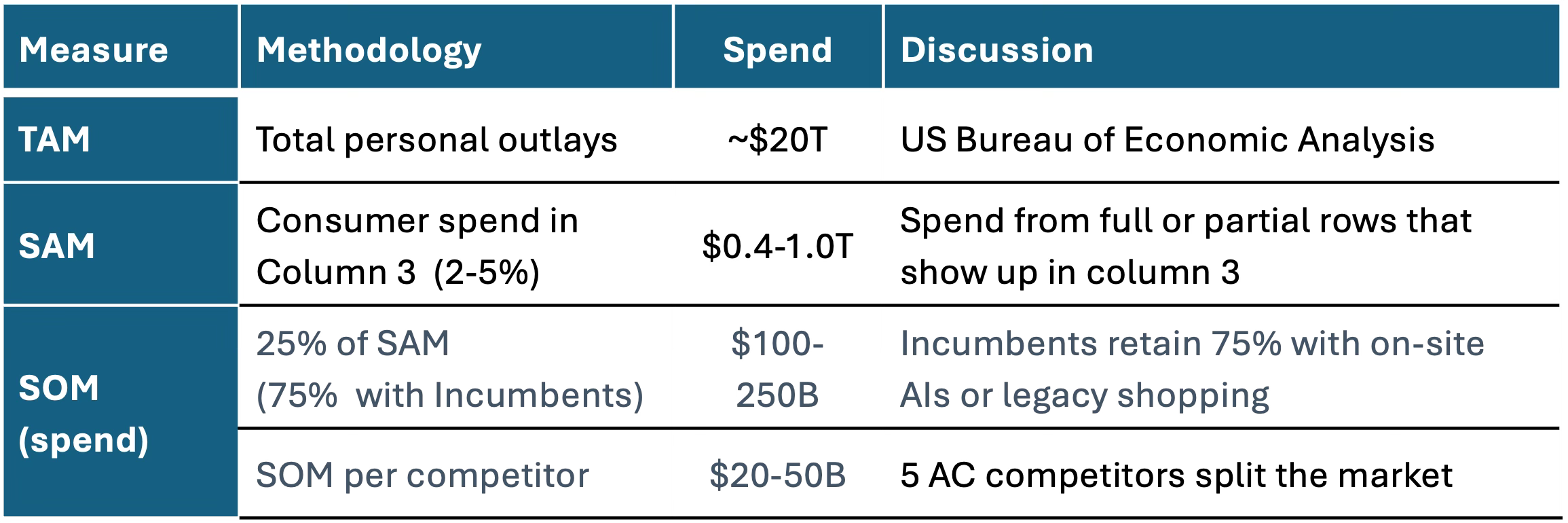 The remainder of consumer spend is either not amendable to AC at all or will remain with incumbents deploying on-site AI