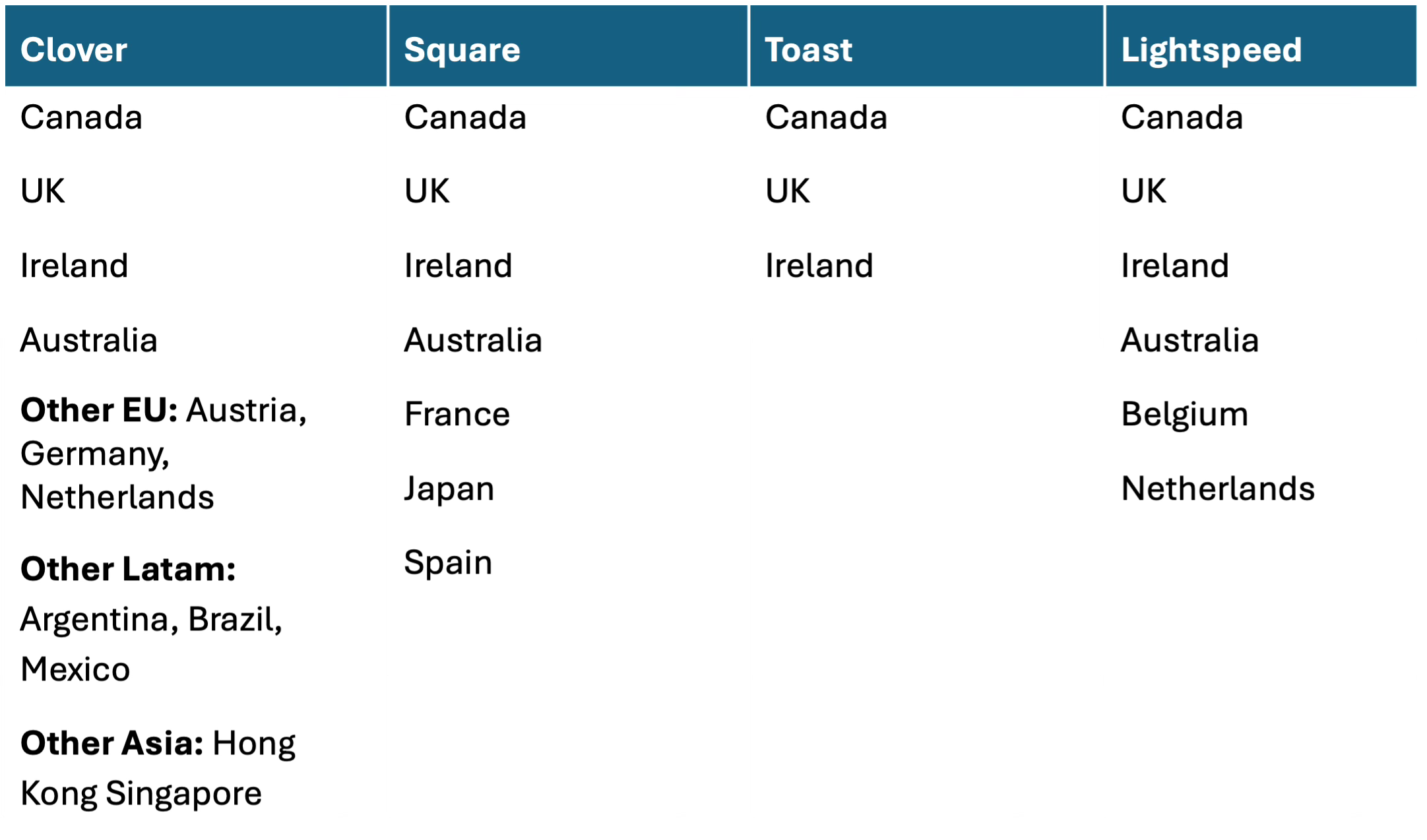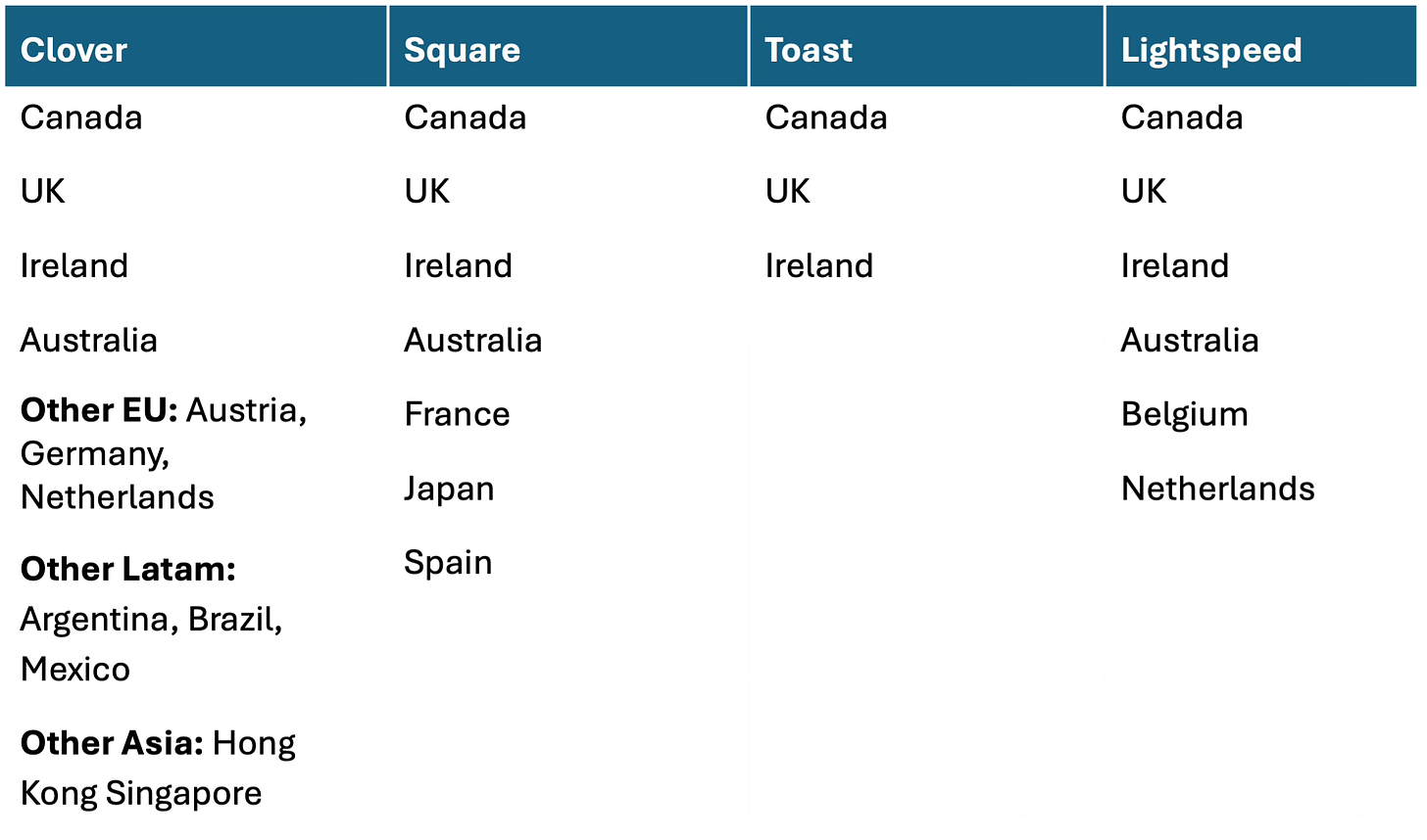 Square & Clover are established globally, while Toast is just getting started. Lightspeed enters the equation as well: