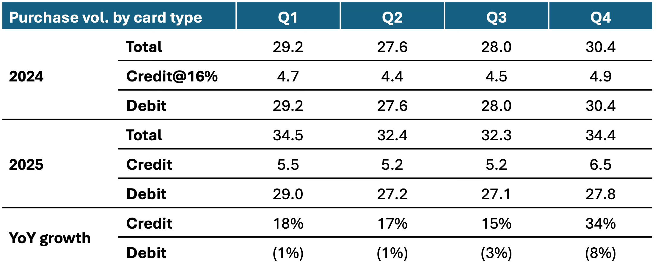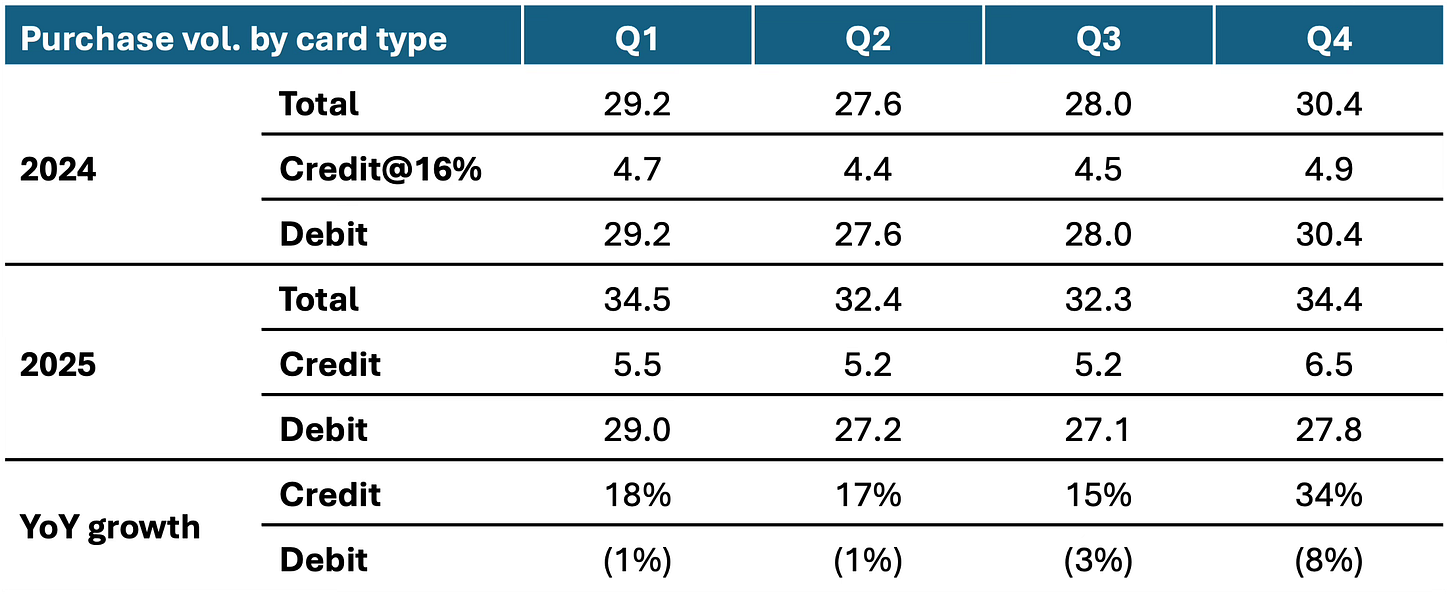 Chime did not disclose 2024 Credit volume but the first three quarters of 2025 all came in at 16% of Purchase Volume so I assumed that rate for full-year 2024. They clearly cannibalized Debit Volume to build Credit volume.
