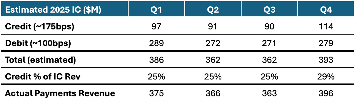 This shift had clear revenue impact in Q4: Chime Card generates ~1.75% IC while the debit card generates ~ 1.0%. That produces the following estimated 2025 revenue: