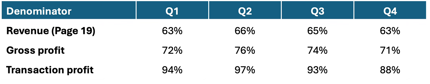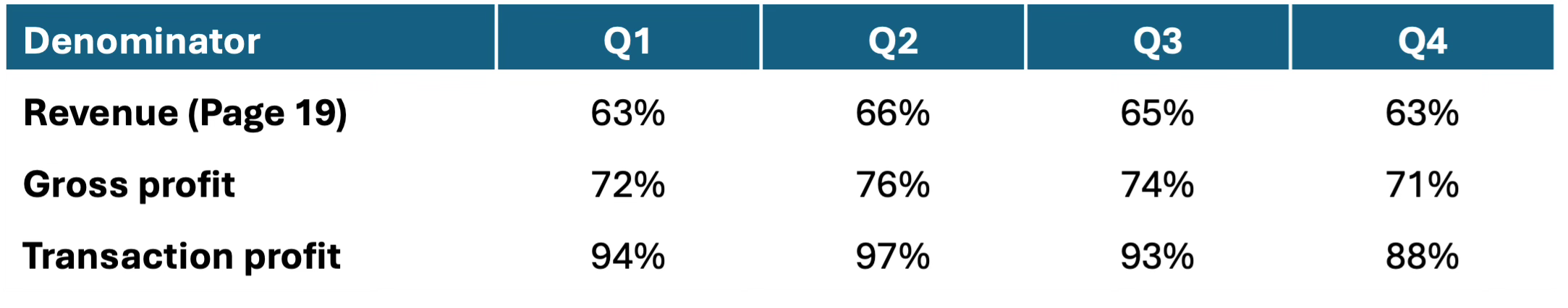 Operating leverage metrics are distorted by using Revenue as the denominator. Using Transaction Profit in the denominator shows poor efficiency but better progress on operating leverage