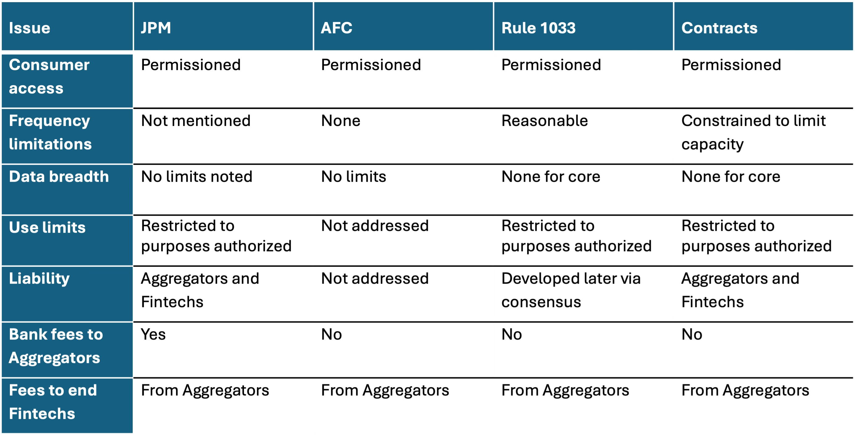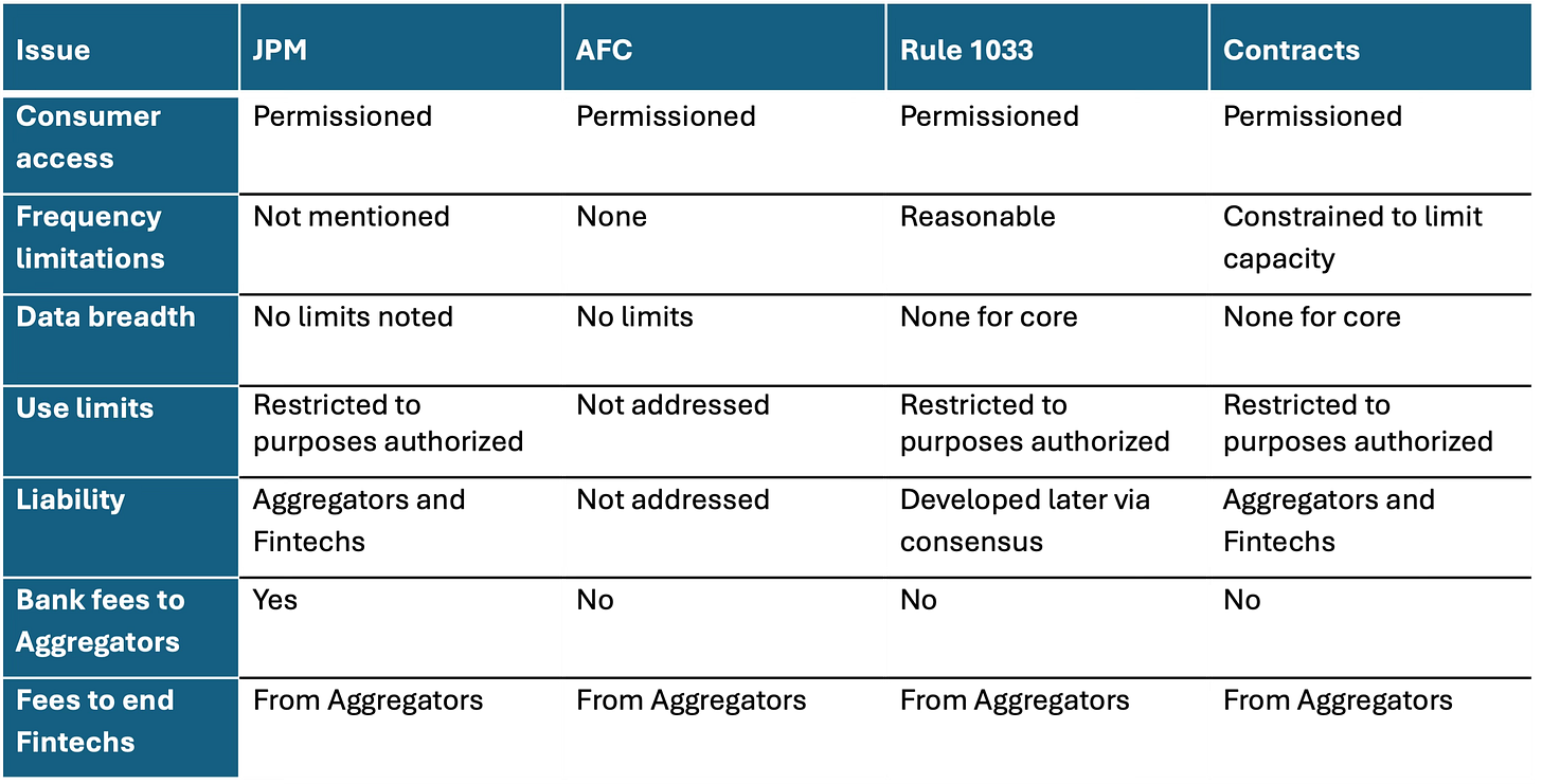JPM wants to charge Aggregators for access while the Aggregators want the data for free (Rule 1033 is on the AFC’s side)
